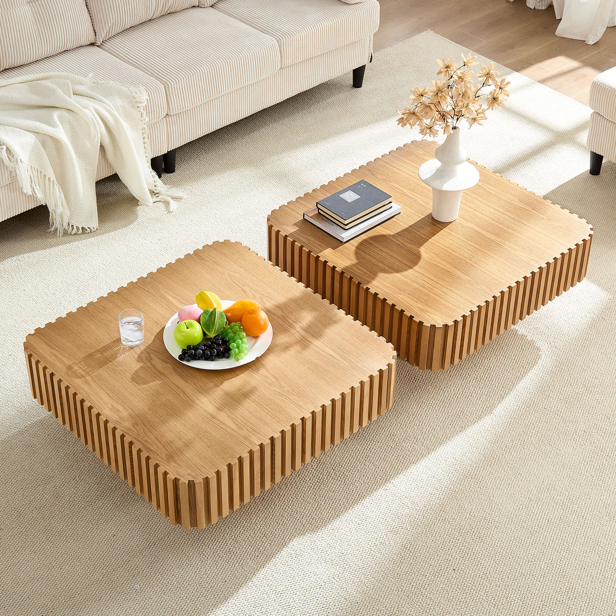 31.5 Inch Modern Handcraft Drum Coffee Table Square Coffee Table For Living Room,Small Wooden Coffee Table With Sturdy MDF Pedesta,Natural Color
