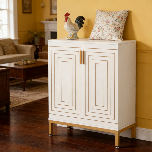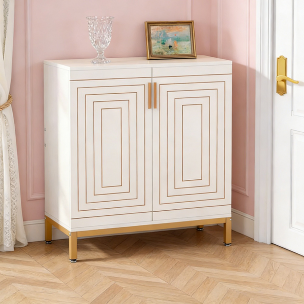 Élégant et fonctionnel - Notre meuble à chaussures autoportant à 5 niveaux est doté de portes géométriques et de cinq étagères intérieures. Ses pieds dorés et sa finition blanche lui confèrent un design épuré et minimaliste, idéal pour votre chambre ou votre entrée.Gain de place - Rangez jusqu'à 15 à 20 paires de chaussures derrière deux portes dissimulées. Le plateau est parfait pour la décoration ou vos essentiels, et l'espace inférieur offre un rangement supplémentaire pour vos chaussures.
